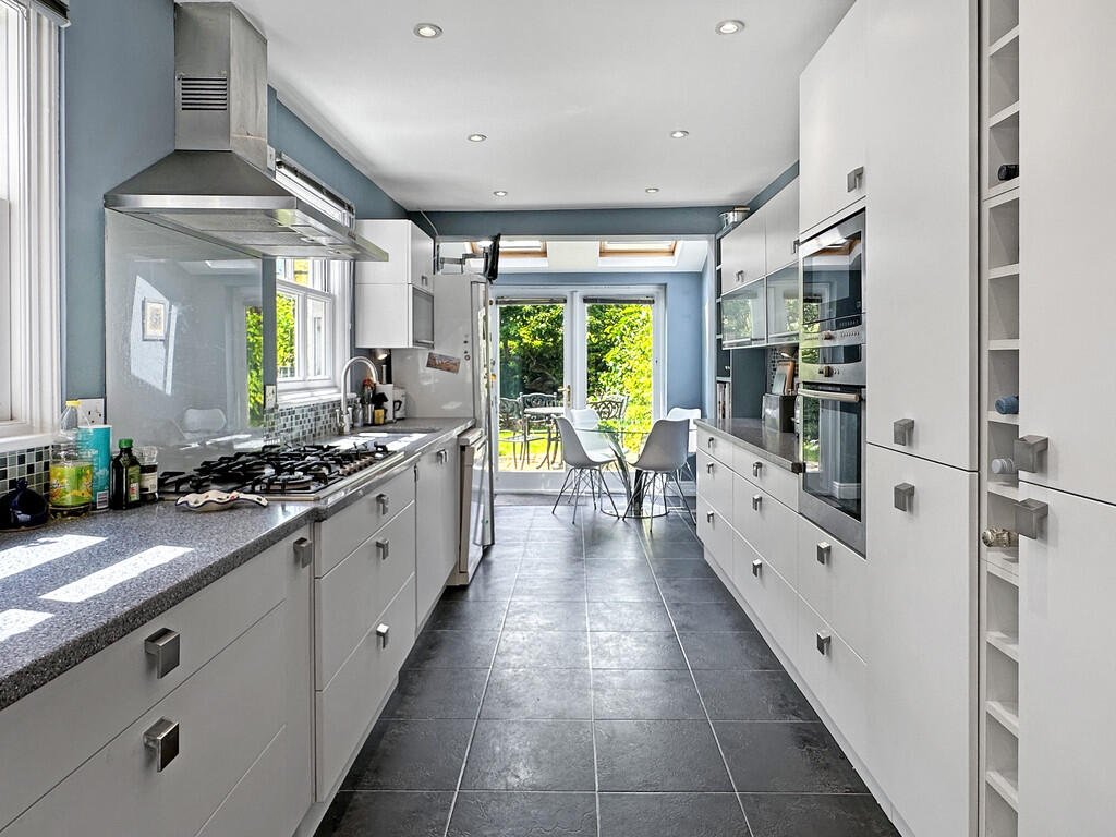 The kitchen is contemporary and spacious, allowing enough space for another breakfast table. It is fitted with high quality wall and base gloss units. There are skylights and additional windows make this a light and airy space. There is a full set of appliances, including integrated fridge freezer, dishwasher and washer dryer. Cooking facilities include six ring gas hob, with extractor over and oven, with microwave above. The downstairs WC cloak room, completes the ground floor accommodation.