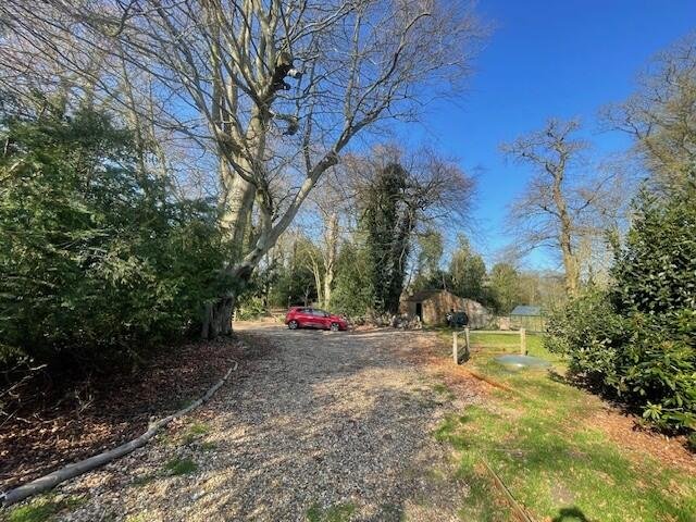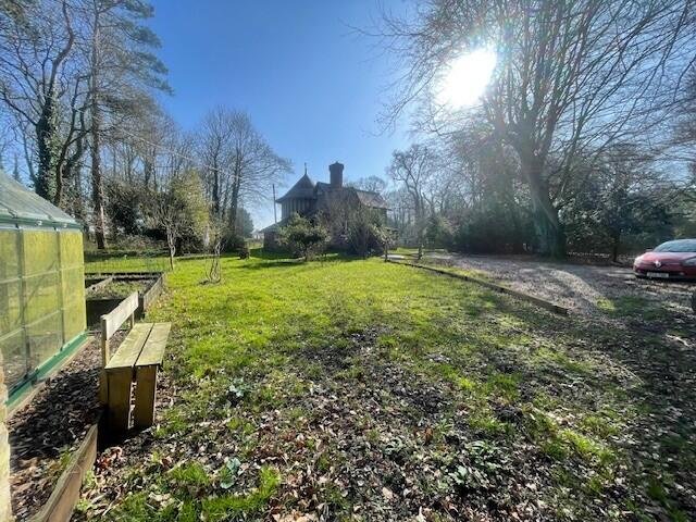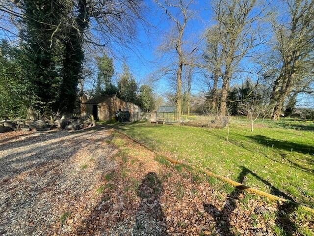 Outside-The garden is mainly laid to lawn with some mature trees and shrubs, driveway parking and outbuildings.
