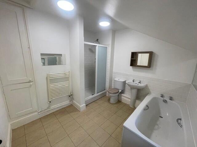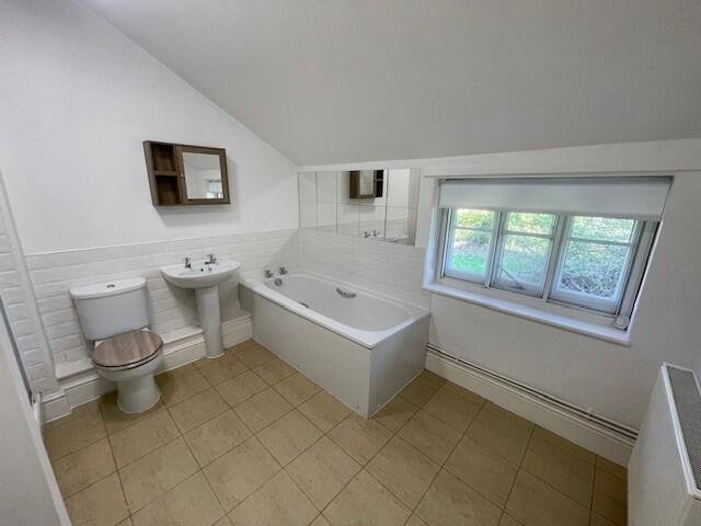 Bathroom-White suite comprising bath with shower over, wash hand basin and WC; extractor fan.