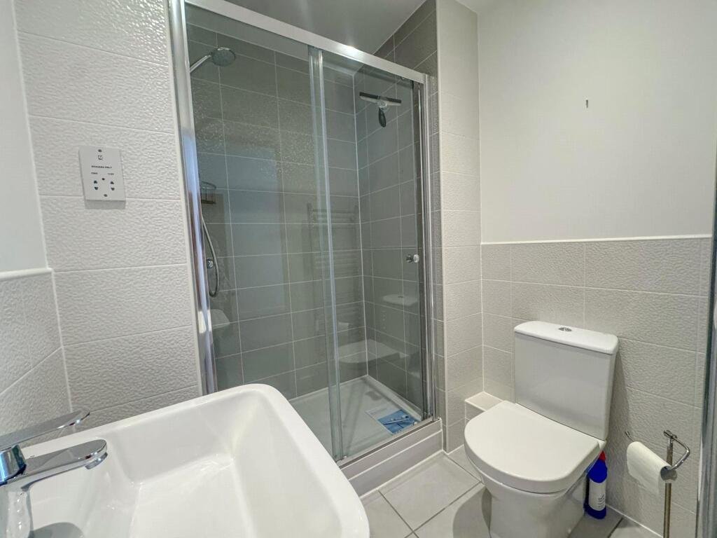 En-Suite – Partially tiled suite comprising WC with dual flush, wash hand basin, double shower cubicle, and heated towel rail.