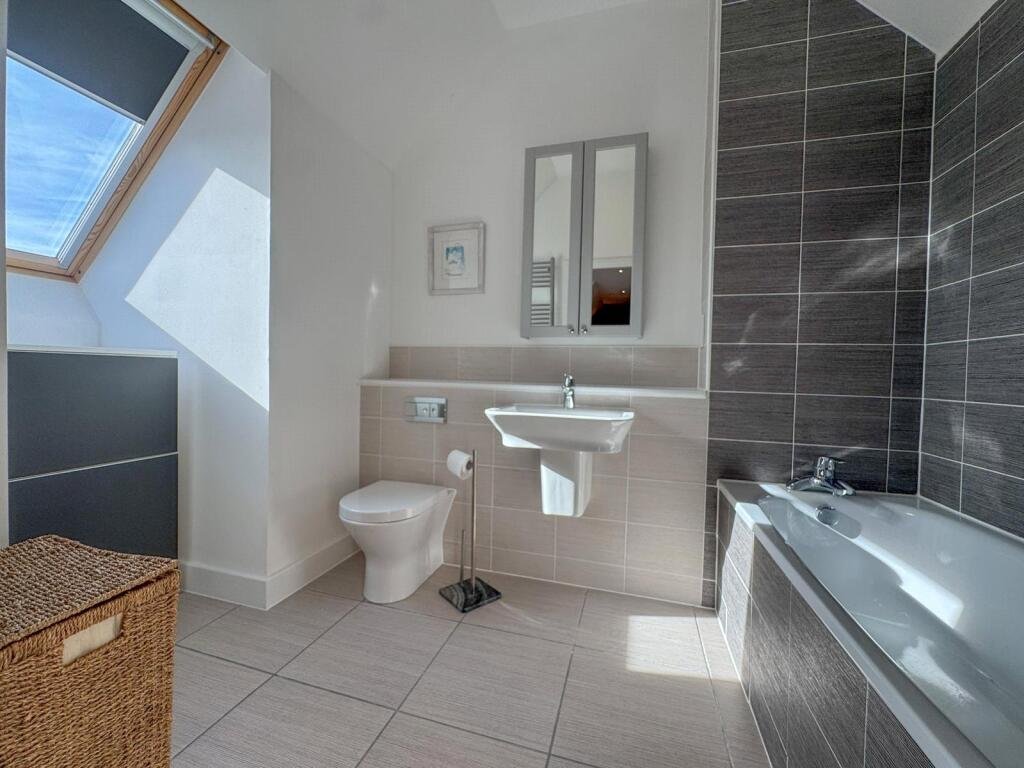 En-Suite – Partially tiled suite comprising WC with dual flush, wash hand basin, bath, heated towel rail, and Velux window to the front aspect.