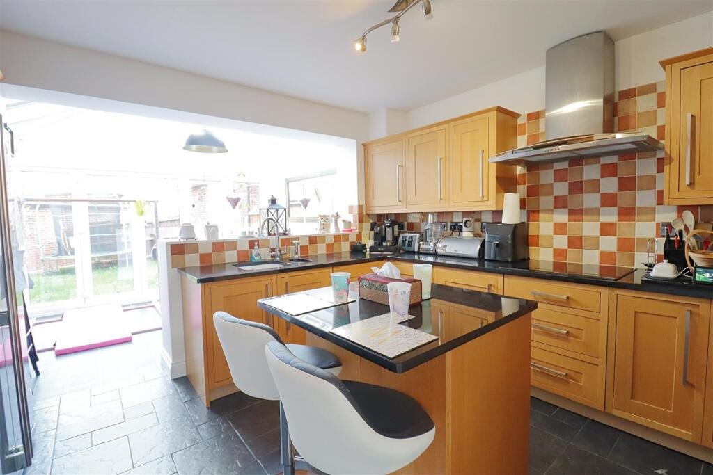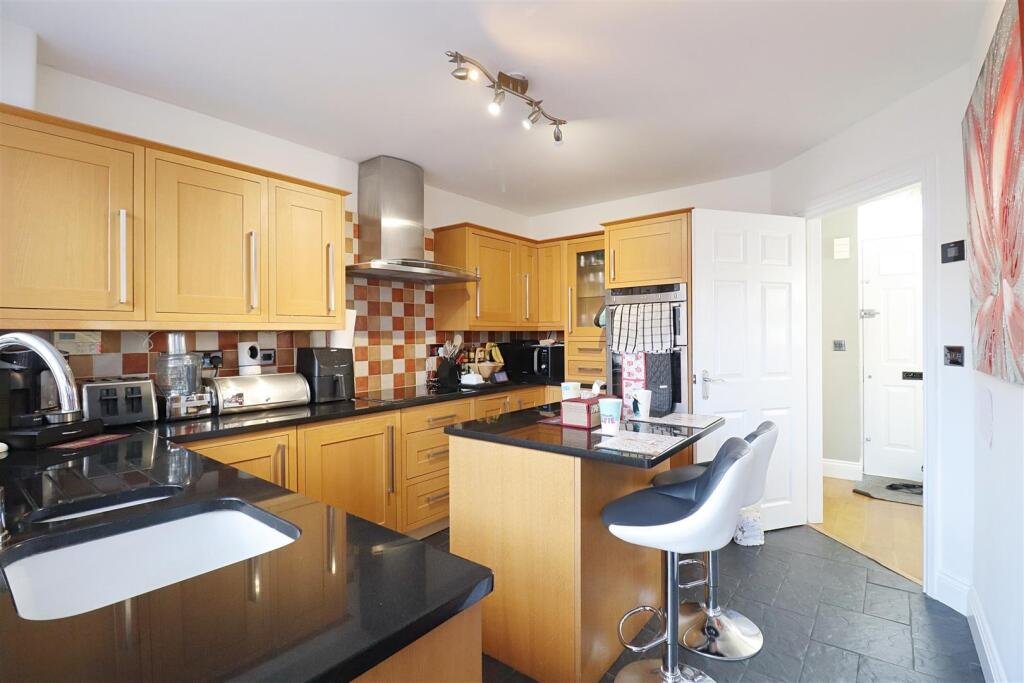 Kitchen/Breakfast Room – 6.83 x 3.57 (22’4″ x 11’8″) – Wall & base units, island with breakfast bar, integrated double oven, electric hob with extractor hood over, space for fridge freezer, one & half sink, patio doors leading to rear garden.