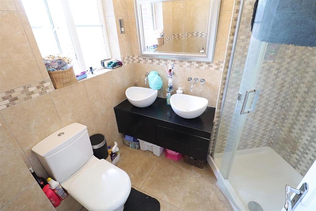 En-Suite – Double shower enclosure, his & hers hand wash basin, WC.