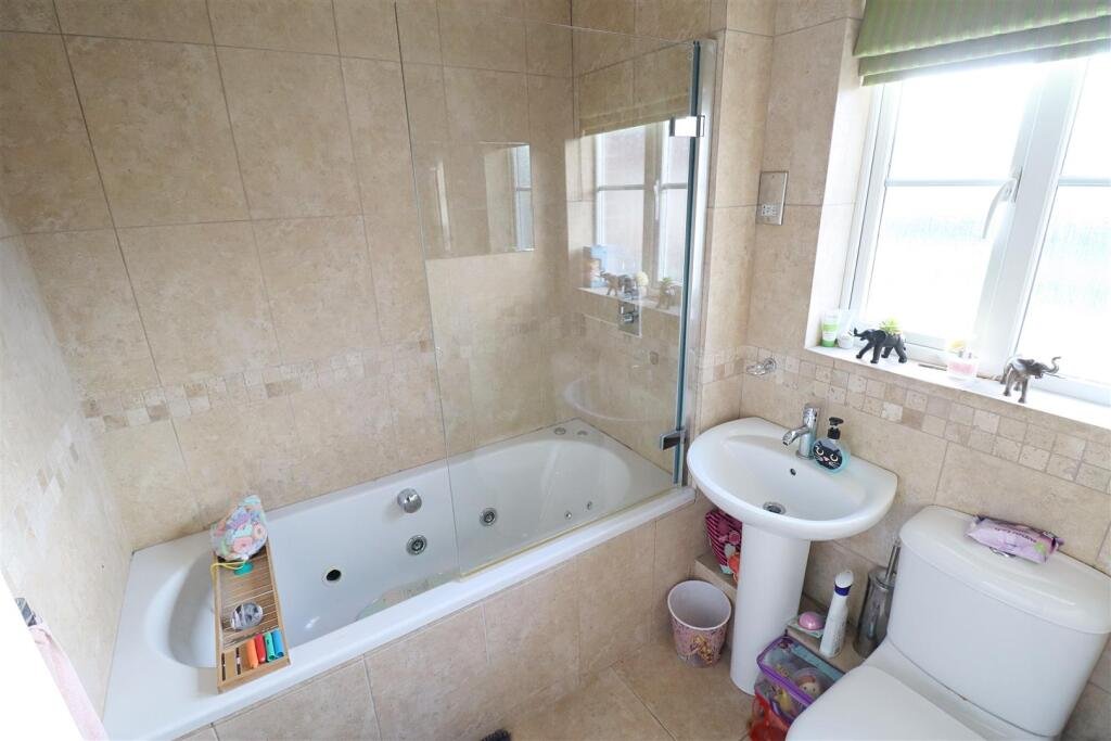Bathroom – Bath with shower over, pedestal hand wash basin, WC, obscure window.