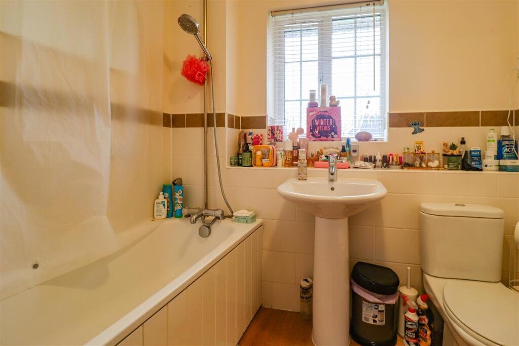 Family Bathroom – with half tiled bath with handheld shower attachment, WC and hand basin, extractor fan in ceiling and window to rear aspect.