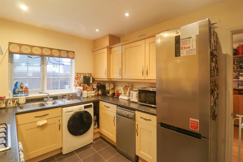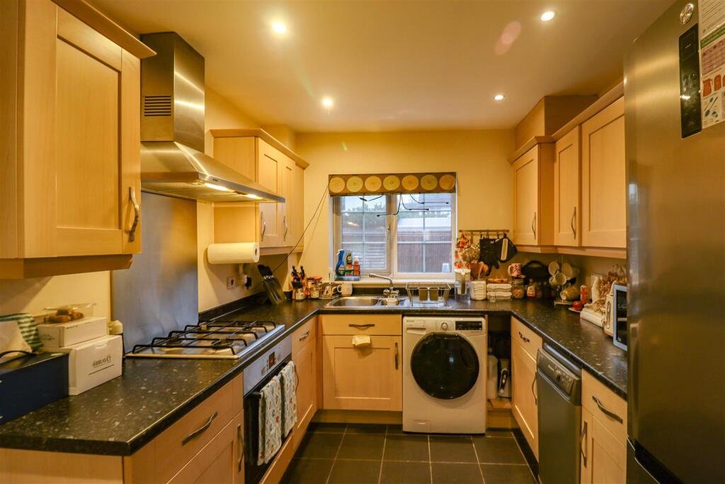Kitchen – with a range of base and wall units, electric oven and gas hob with extractor over, sink with mixer tap, slimline dishwasher and space for washing machine. Door leading into garage.