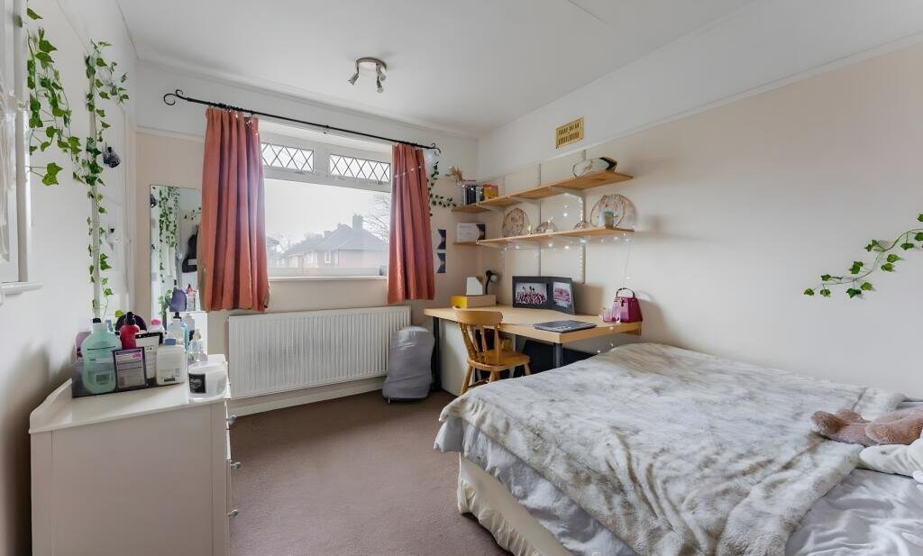 Bedroom Three (Double) 9’4” x 8’5”Window to the rear aspect. Double bed, wardrobe with drawers, desk, bedside table, shelves. Carpeted.