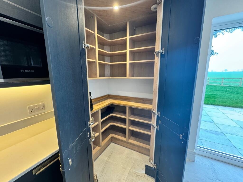Ceramic tiled floor, bi-fold doors to the rear garden.  Fitted with a range of base and wall cabinets with complimentary worksurfaces and an inset sink. Appliances consisting of an integrated oven, hob, extractor, fridge/freezer and dishwasher. Full size corner larder cupboard.