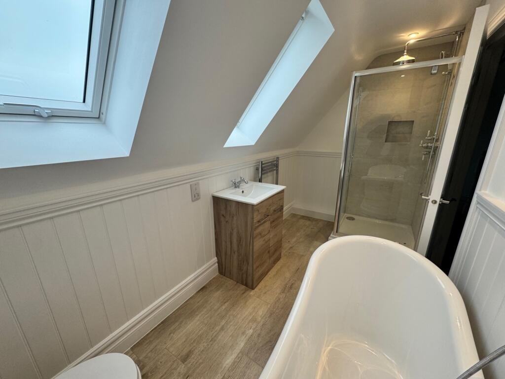 En-suite. Suite consisting of a free standing bath, separate shower cubicle, wash basin and w.c.