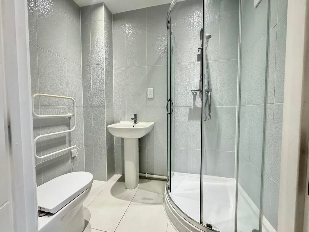 BathroomModern WC, basin, shower cubicle, tiled floor, extractor fan
