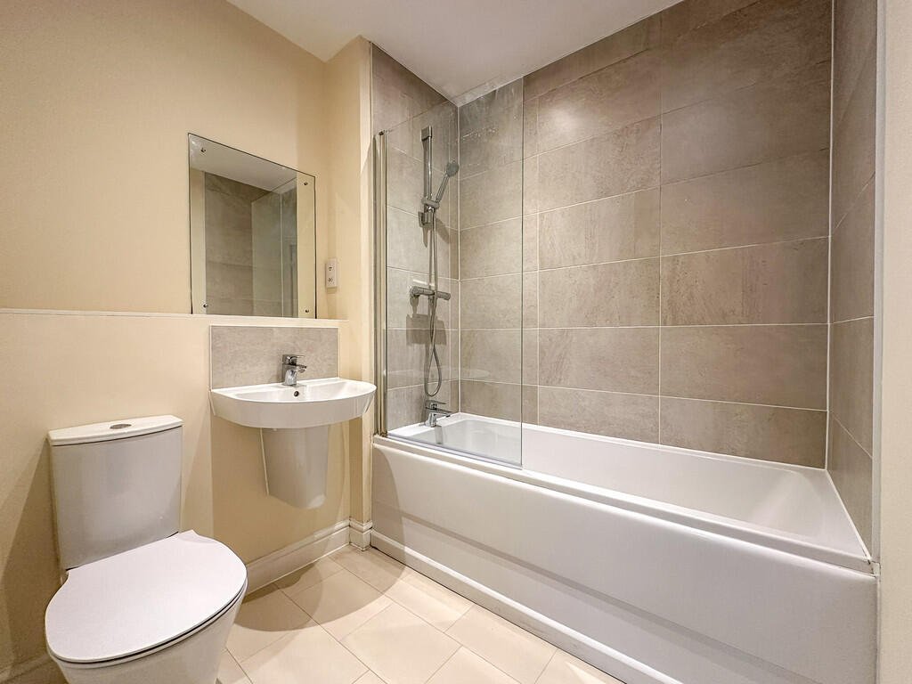 BATHROOM A modern family bathroom with white suite and feature tiles. Bath with shower over, basin, mirror, radiator with towel rail over and toilet.Â