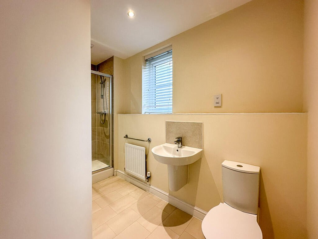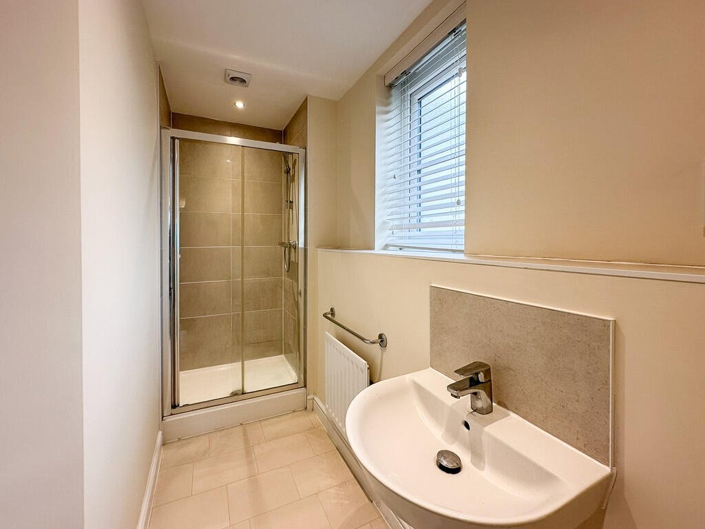 The ensuite shower room is modern white suite and fitted with a toilet, basin, mirror, radiator with towel rail over and enclosed shower cubical with feature grey tiles.Â