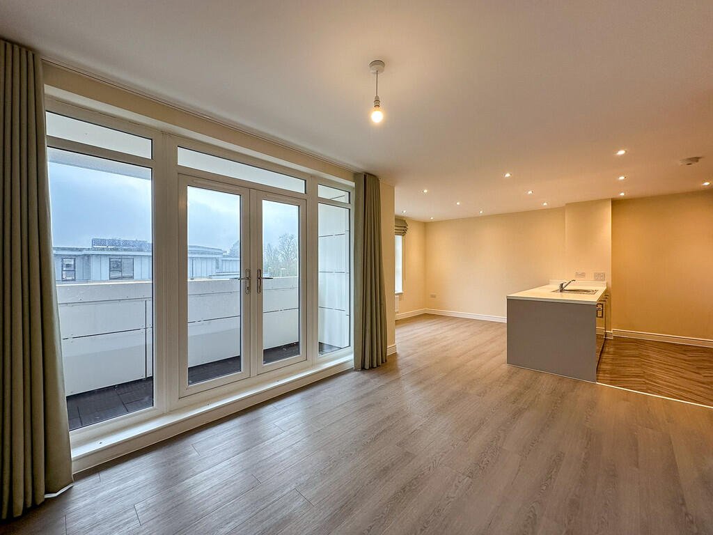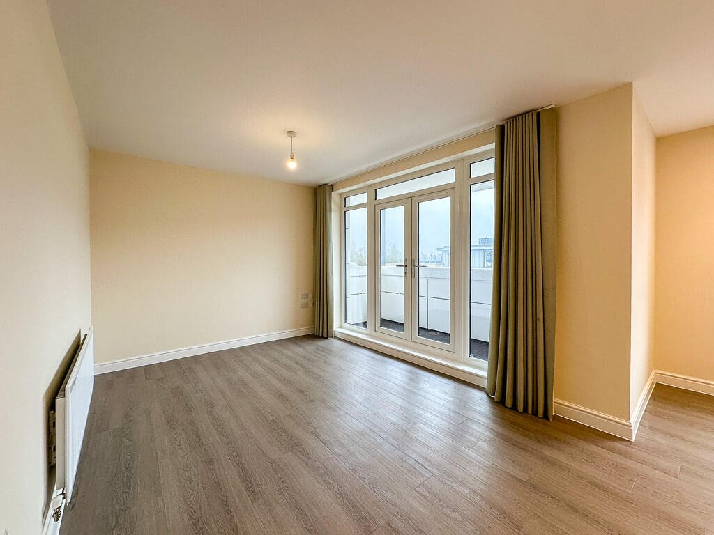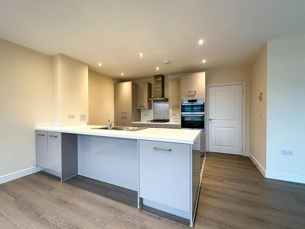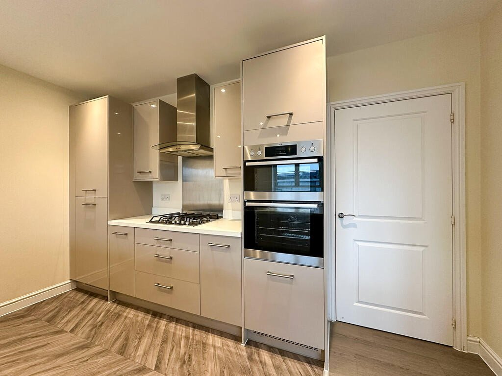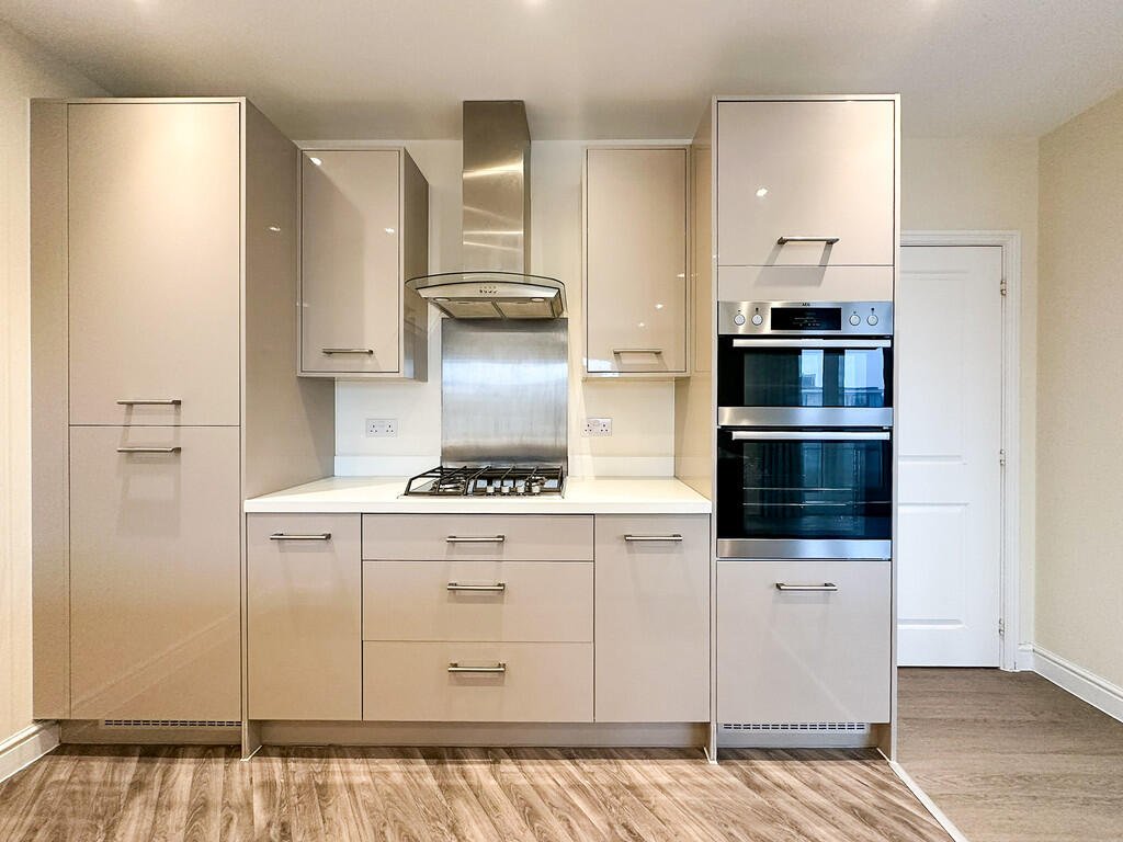 OPEN PLAN KITCHEN LIVING SPACE A bright and spacious open planned kitchen living space with wall and floor units with an area that can double as a breakfast bar. With modern grey high gloss units and integrated appliances including a fridge freezer, dishwasher, washer dryer and a double oven. With wood effect laminate flooring throughout and large French doors out to the private balcony.Â
