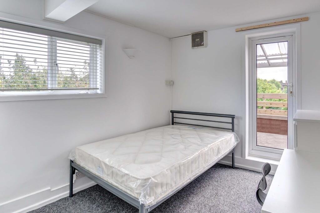 Room 5 is a functional double bedroom with plenty of storage and a modern en-suite bathroom. It comes fully furnished with a double bed, desk, clothes storage, and a mini fridge. It also includes an access door to the balcony.