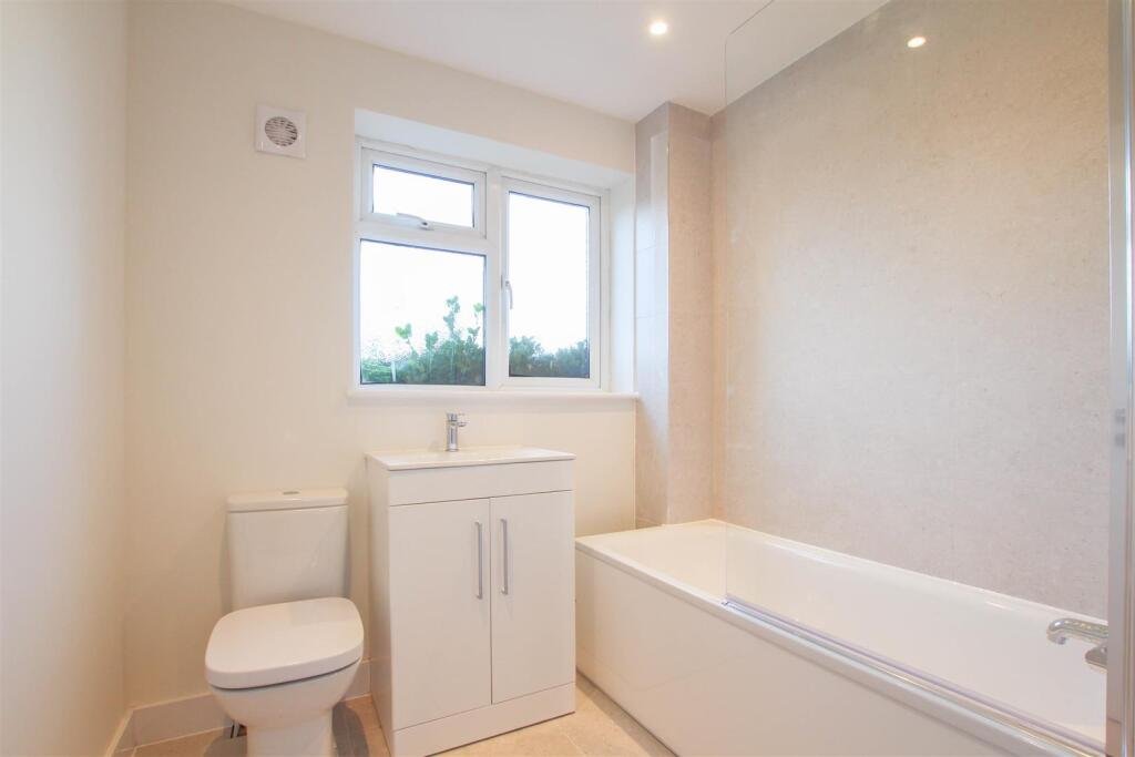 Bathroom – Comprising white three piece suite with panelled bath and shower over, sink with vanity unit below and W/C. Obscured window overlooks the front aspect.