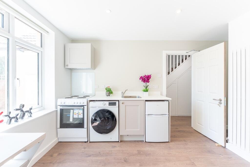 Room is furnished with small double bed, desk and chair. Fully fitted kitchenette with cooker, extractor hood, fridge/freezer, washing machine, sink and cupboards. Bathroom with WC, basin and shower.