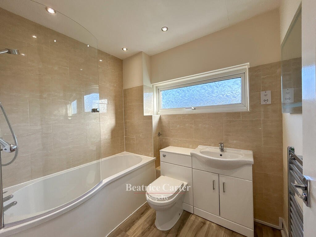 Bathroom – 6’08” x 7’05” (2.03m x 2.26m), luxury vinyl tile flooring with shower over bath, heated towel rail, hand basin, WC, and LED mirror.Â