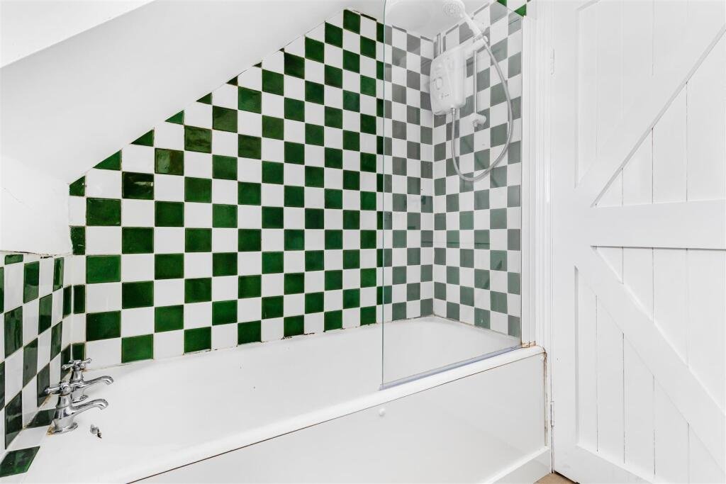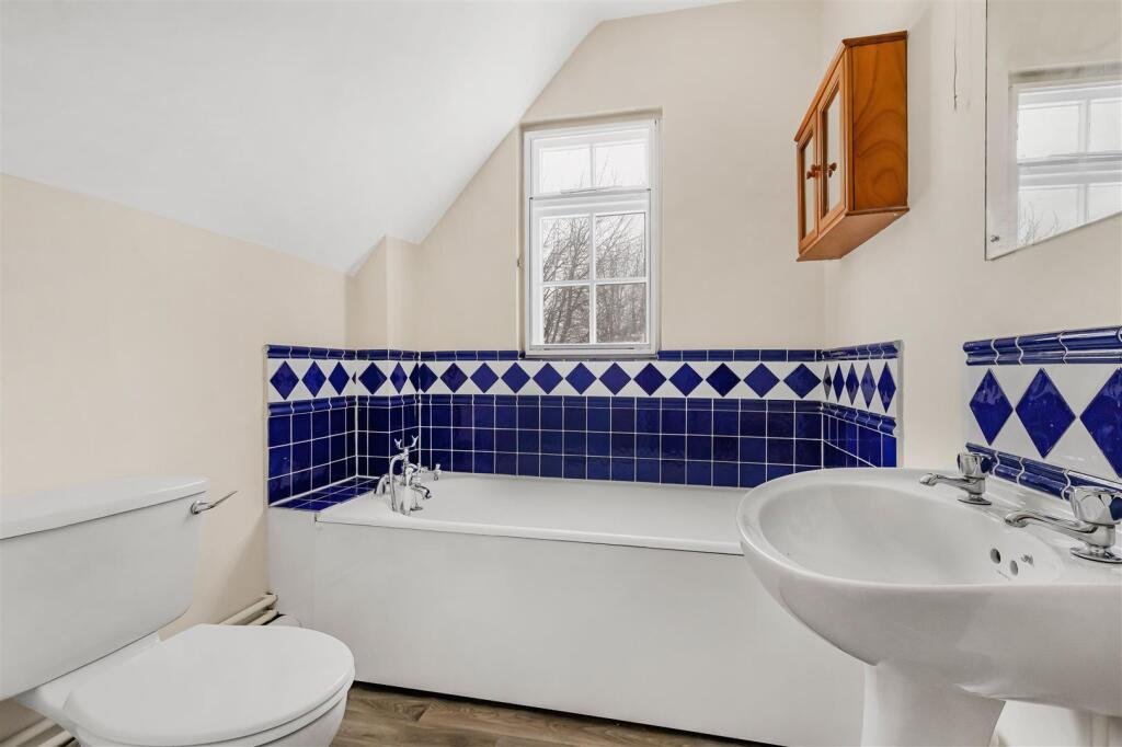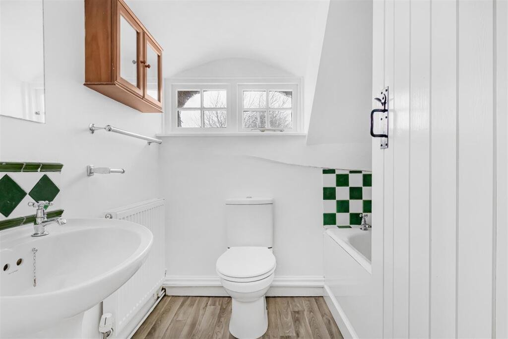 Bathroom 2 – with bath with shower, pedestal hand basin, low level WC, tiled splash backs, radiator, window to side aspect.