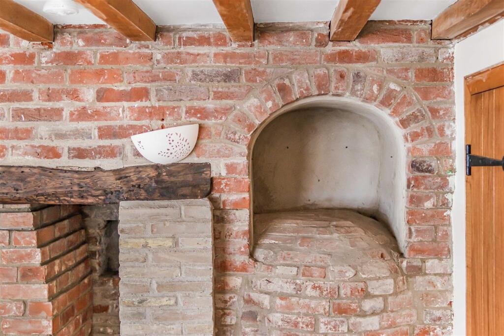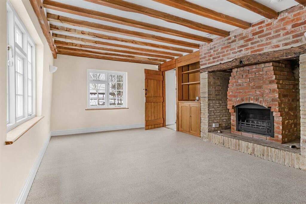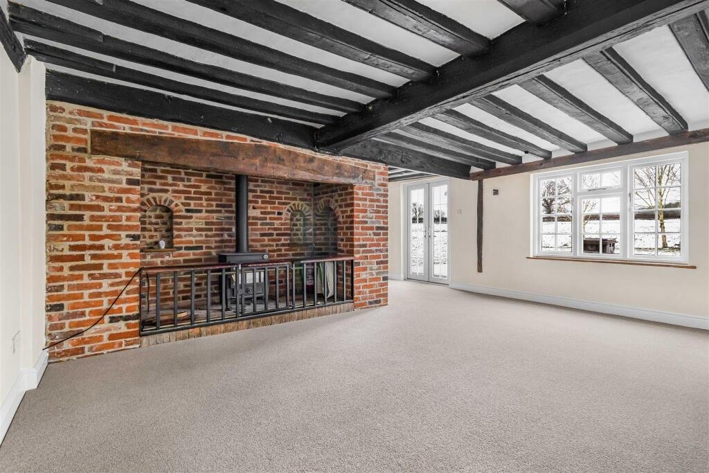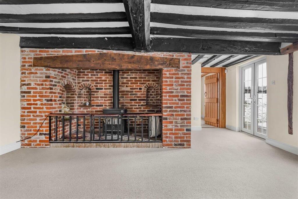 Living Room / Dining Room – 5.37 x 3.60 (5.40 max) (17’7″ x 11’9″ (17’8″ max)) – with inglenook fireplace with brick hearth, bressumer beam, radiator, window to side aspect, pair of French doors leading to rear garden.