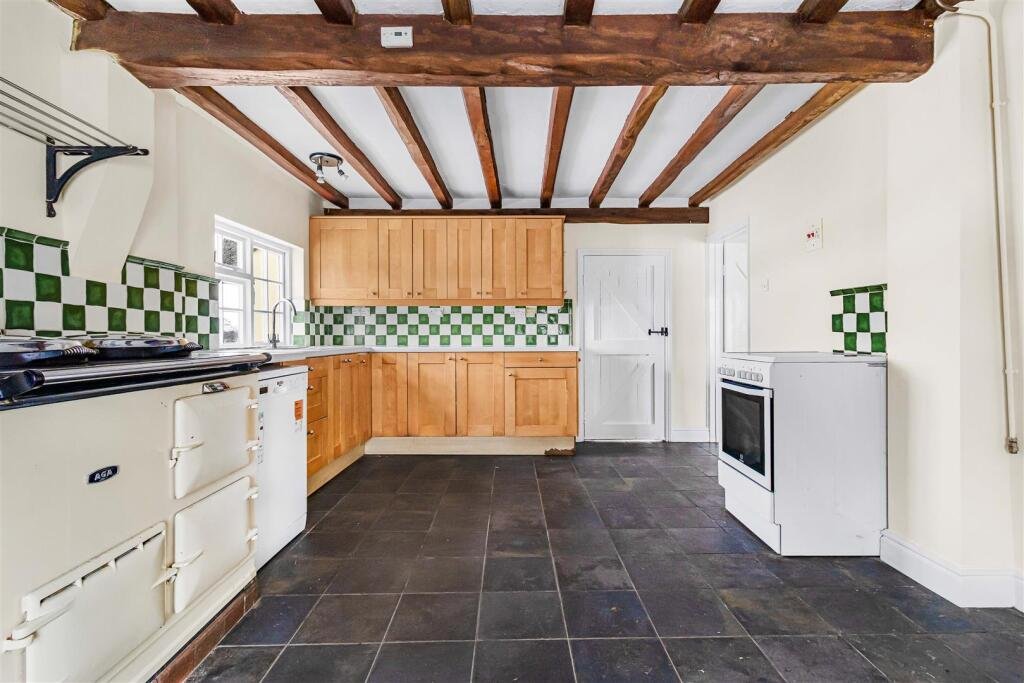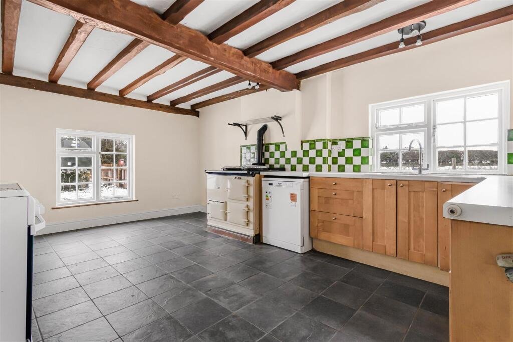 Kitchen / Breakfast Room – 5.31 x 3.63 (17’5″ x 11’10”) – with 1.5 bowl stainless steel sink and drainer, fitted base and wall mounted units, worktops and tiled splash backs, tiled flooring, AGA range, exposed oak beams, windows to front and side aspects.