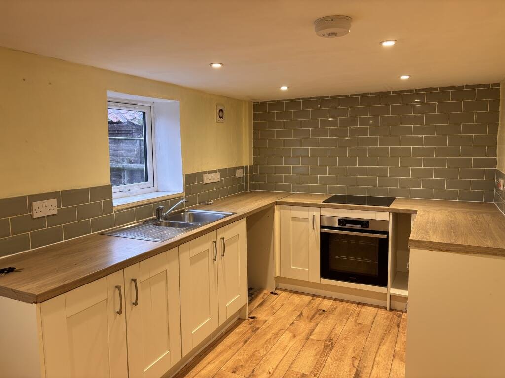 base units with wood effect worktop over. Part tiled walls, extractor fan, 1.5 stainless steel sink and drainer unit with hot and cold taps over. Space and plumbing for washing machine.Integrated electric oven with four ring hob over. Stairs to first floor behind door and cupboard understairs with oil boiler.