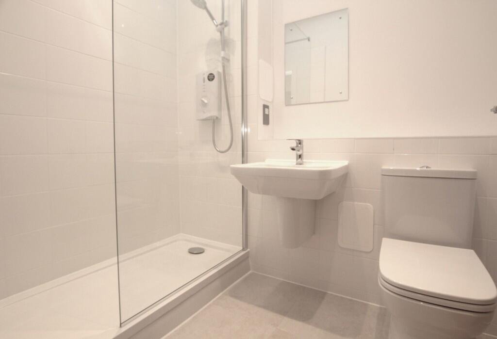 SHOWER ROOM Double width shower cubicle, electric towel rail, low level WC, wall mounted wash hand basin.Â