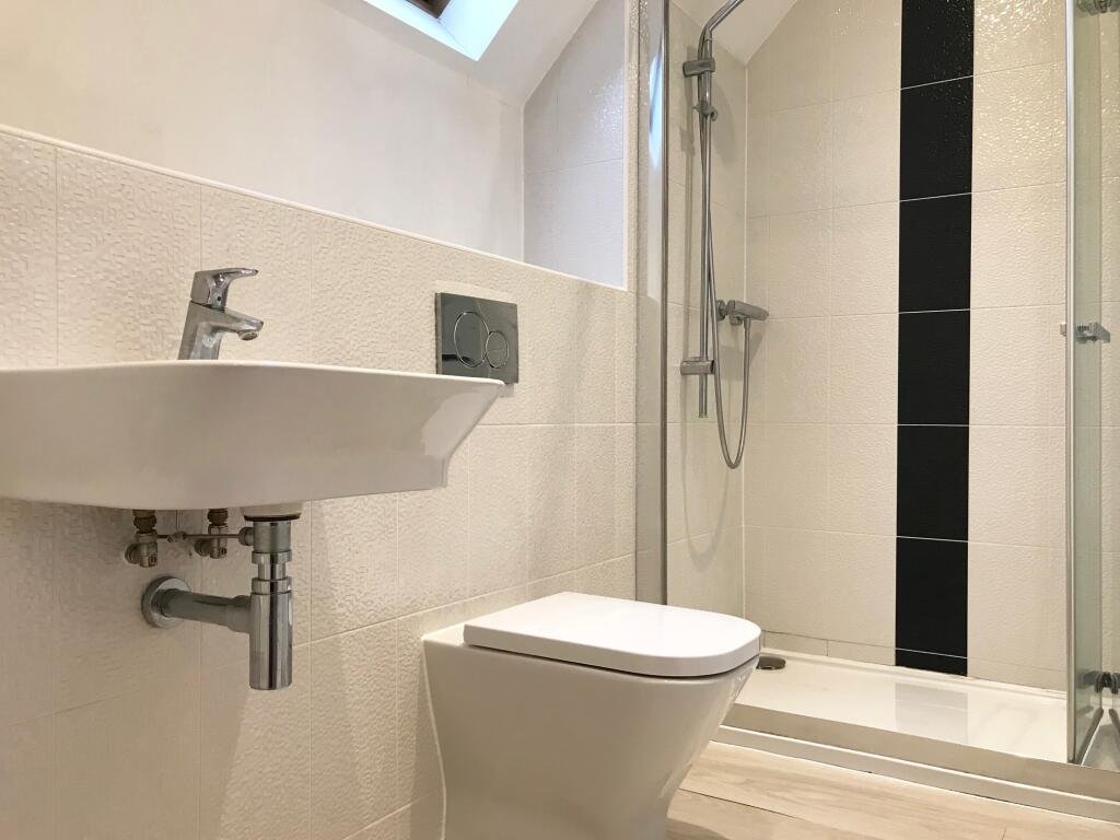 Downstairs WC – Matching white sink and basin with white detailed tiles and chrome finishings.