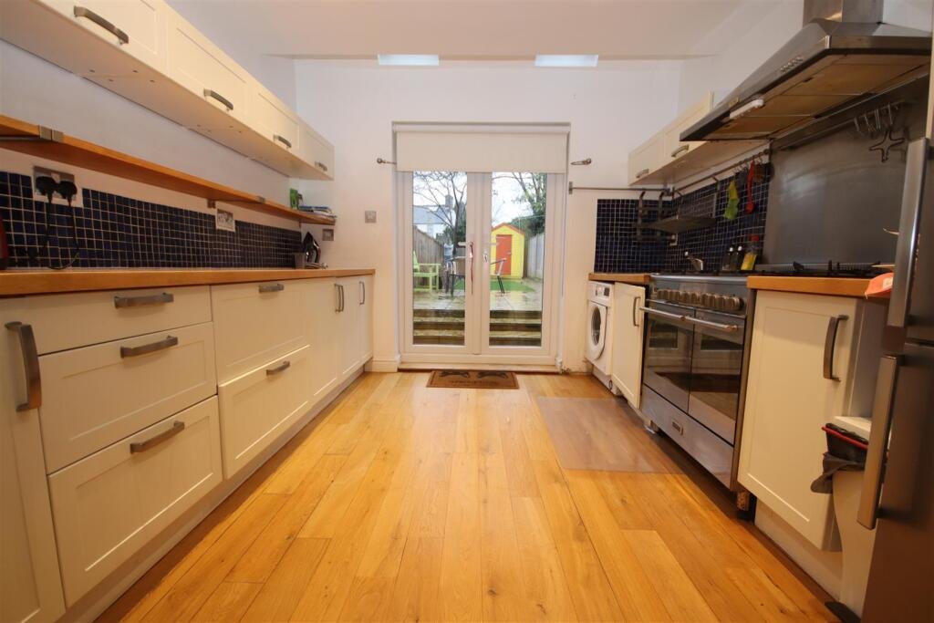 Kitchen – 3.39 x 3.016 (11’1″ x 9’10”) – Rear well fitted kitchen with 6 ring gas range with 2 ovens, fridge freezer and washing machineWood flooring. French doors leading to the garden