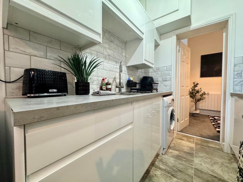 KitchenModern range of wall and base units with an electric hob & electric oven with extractor over, space for a tall Fridge/Freezer, plumbing for a Washing Machine, tiled flooring.