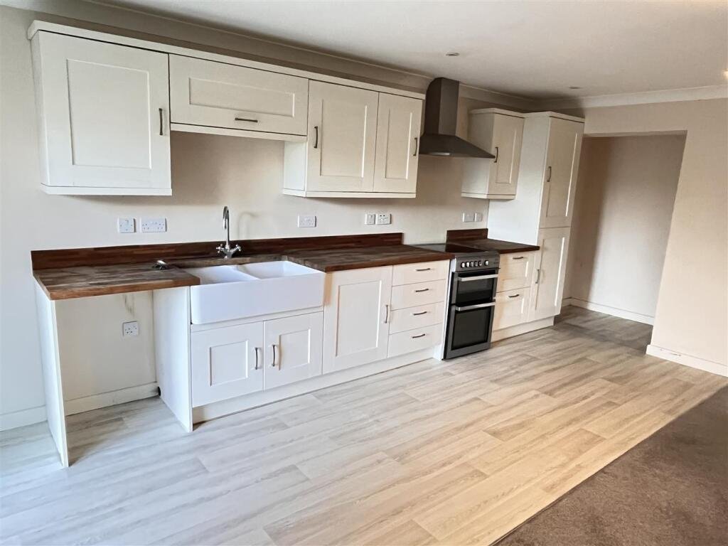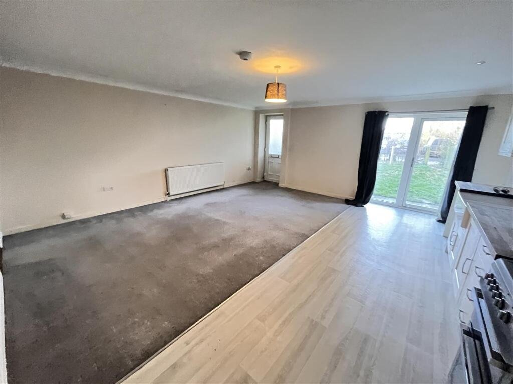 Living Area/ Kitchen – 5.57m x 5.45m (18’3″ x 17’10”) – Fitted with a range of base and eye level kitchen units with solid wooden work surface over inset with a double bowl butler sink with mixer tap over. Space for electric cooker with extractor hood above. Space and plumbing for washing machine. Space for dining table and seating area. Double panel radiator and patio doors leading to the rear. Door giving access to the understairs airing cupboard housing the hot water tank, heating controls and fuse board.