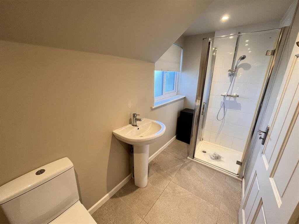 Shower Room – Fitted with low flush WC, pedestal wash basin and fully tiled shower cubicle with Bristan shower unit. Heated towel rail and extractor fan.