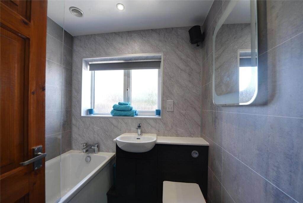 BATHROOM:Suite comprising of low level WC, handbasin built into vanity unit, bath with shower over, heated towel rail, mirror, Sonos speaker and window to rear.
