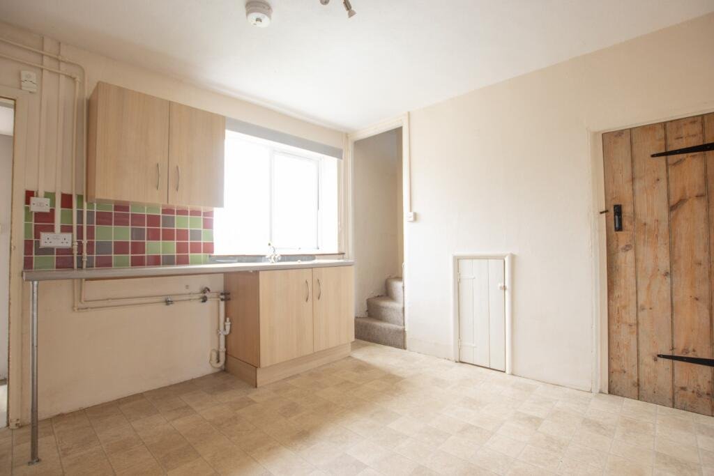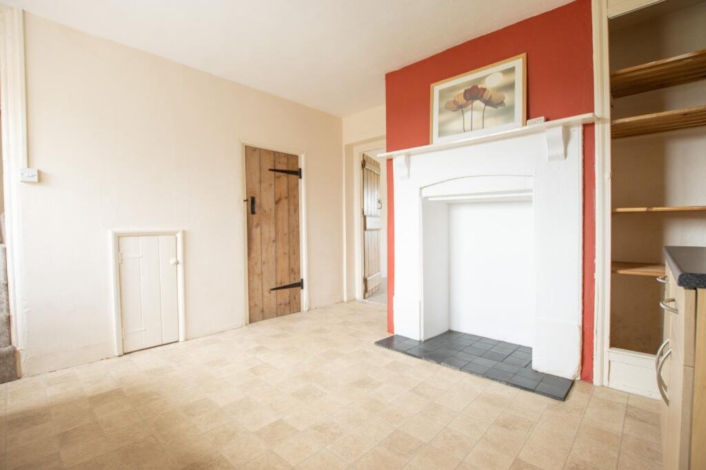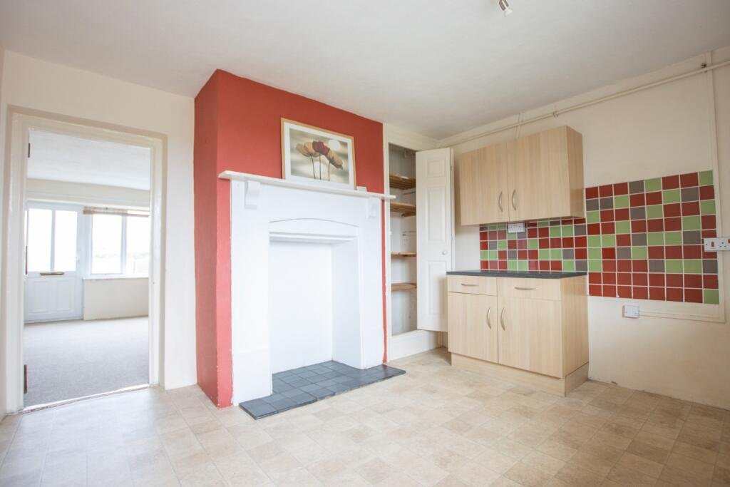 The front door opens into the well-proportioned sitting room, with carpeted flooring, an open fireplace and fitted storage in the chimney recess. A door from the sitting room leads into the kitchen, which comprises a range of storage units under fitted work surfaces, with plumbing/space for a dishwasher