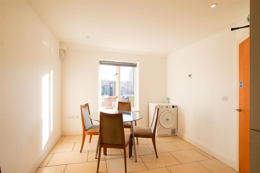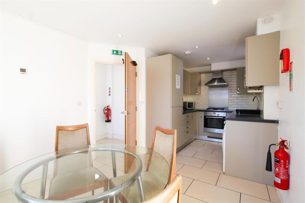 Communal Kitchen/Dining Room – kitchen comprises base and wall units, work tops, sink with window to side aspect above, and appliances comprising oven, electric hob with extractor above, fridge freezer, dishwasher, washing machine and tumble dryer. Dining area with window to front aspect and furniture comprising dining table with chairs.