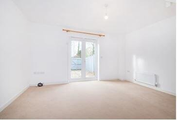 The accommodation includes a well-proportioned lounge featuring useful under-stair storage and double doors opening directly onto the rear garden. The modern kitchen is fitted with an oven, hob and extractor, complemented by a convenient ground floor WC.