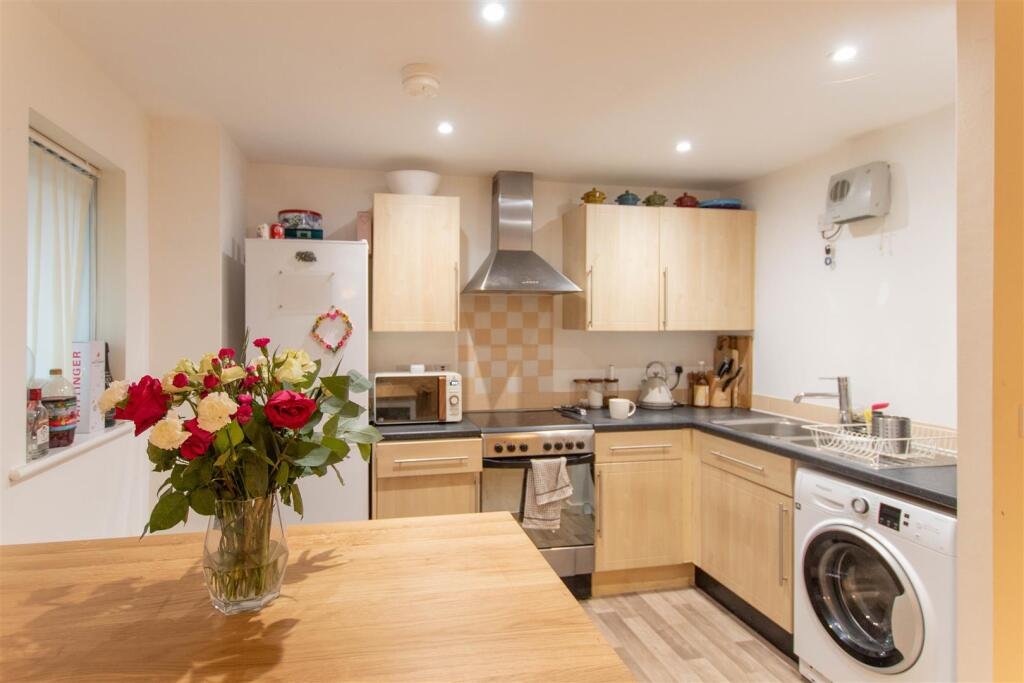Kitchen Area – 3.23m x 2.11m (10’7″ x 6’11”) – Fitted wall and base units with worktop over, electric cooker with extractor hood, space and plumbing for appliances, window