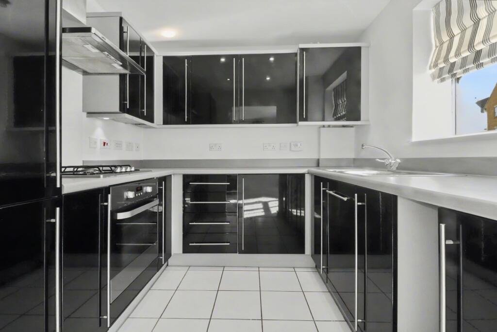 Kitchen – 2.52m x 2.45m Tiled flooring, Range of glossy wall and eye units. Gas 4 ring hob and electric single oven. Integrated Fridge