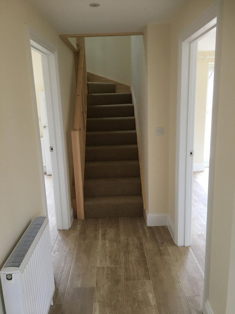 Entrance hall with wood effect tiled floor and hanging area for coats. Carpeted stairs leading to first floor.