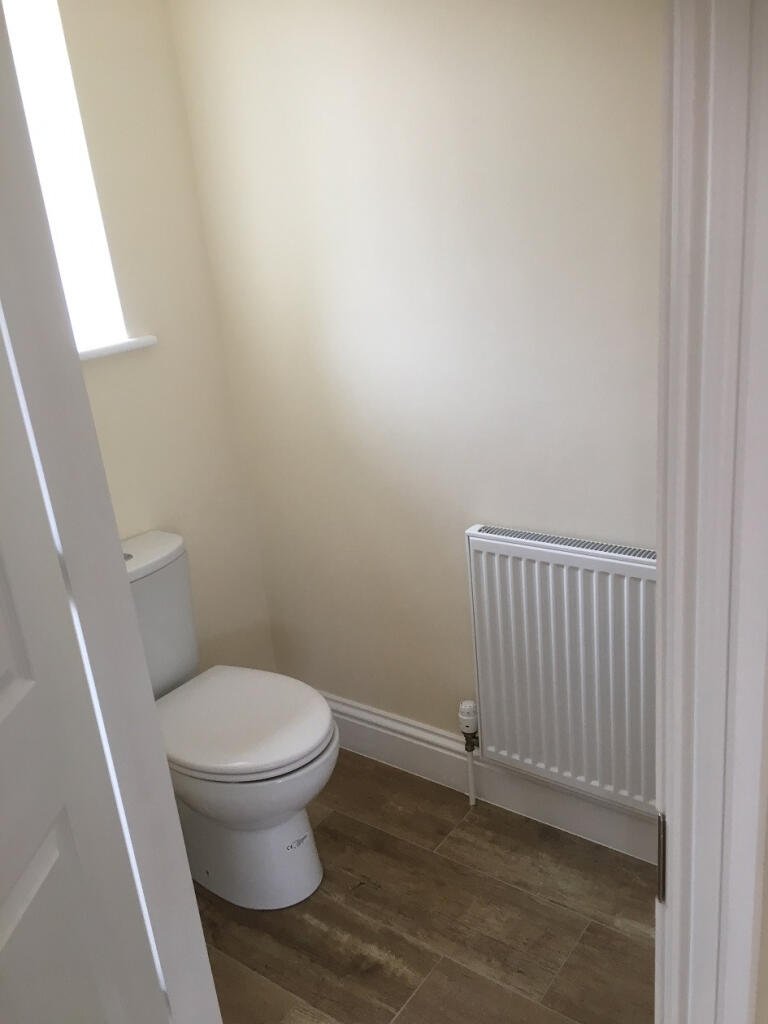 Cloakroom with white toilet suite. Wood effect tiled floor.