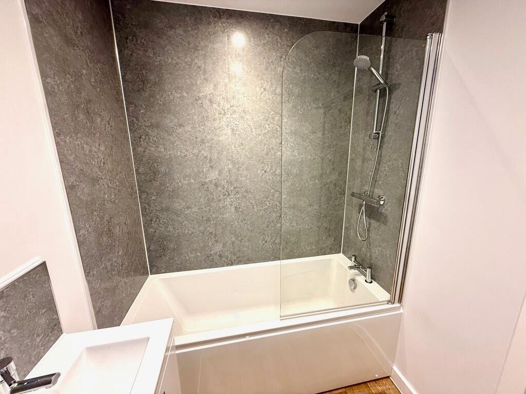 BATHROOMModern white suite comprising a bath with thermostatic shower over, wall panelling to the suite area, wash hand basin with vanity unit beneath, and low-level WC. Additional features include a heated towel rail