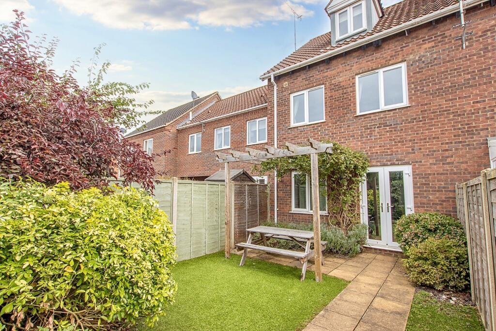 the property is approached over a short pathway with planted flower beds either side of the front door. The rear garden enjoys a west-facing orientation, with afternoon and evening, as well as sunset views. The garden has been laid to artificial turf and paving for ease of maintenance, along with a timber pergola. From the garden, there is a side door into the garage, which has an up and over door leading to the block-paved parking area, which provides parking space for one vehicle and also has a gate leading back into the garden.