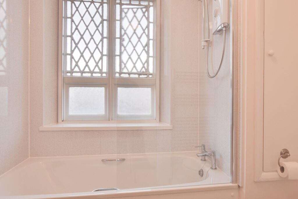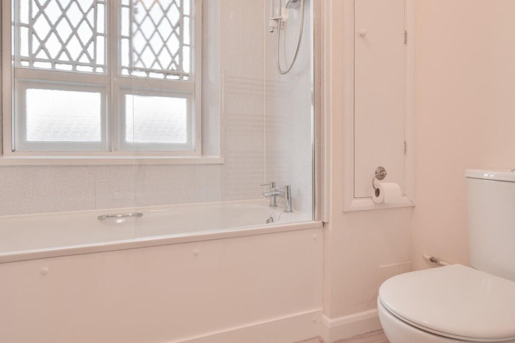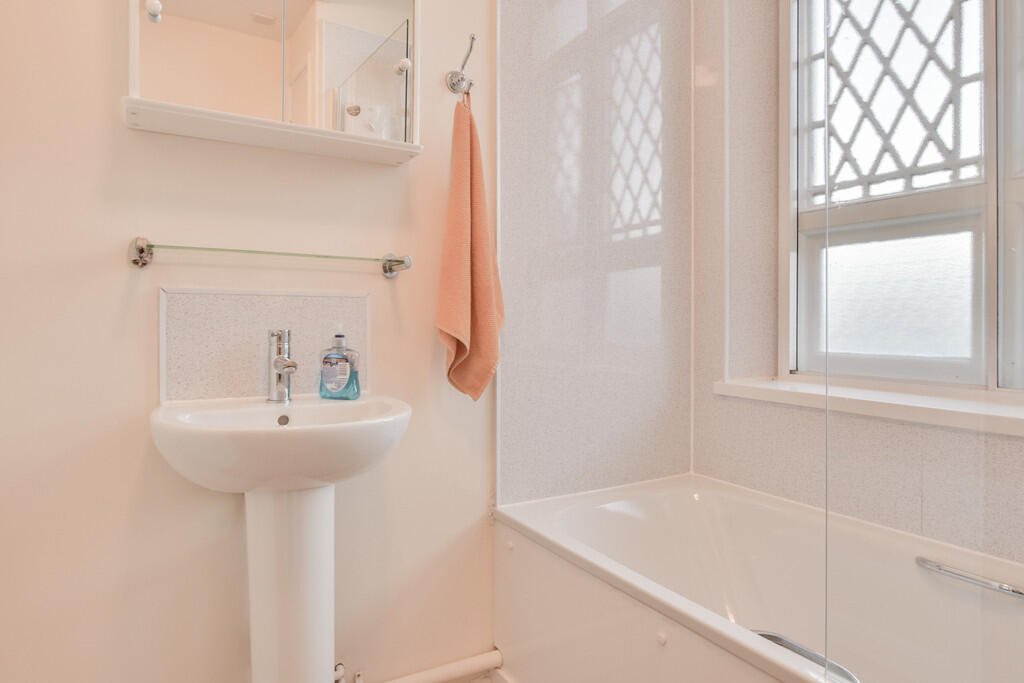 Family Bathroom Comprising a three piece suite of panel enclosed bath with mixer tap and shower attachment over, half-tiled surround, close coupled WC, pedestal wash hand basin with mixer tap, tiled splashback and storage cupboard above with mirrored sliding doors, extractor fan, storage cupboard, wall mounted chromium heated towel rail, obscure window to front, inset ceiling downlighting and wood effect flooring.Â