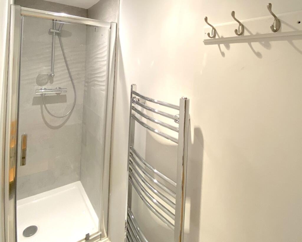 Kitchen/Dining room – Beautifully presented and spacious providing ample space for family living the room includes a modern kitchen area with iron and level base units and quality white goods, including a built-in oven and microwave, gas hob, freestanding fridge/freezer, washing machine and tumble dryer. The living area is particularly light with remote controlled Velux windows and glazed doors to the rear opening to the garden. A shower room with