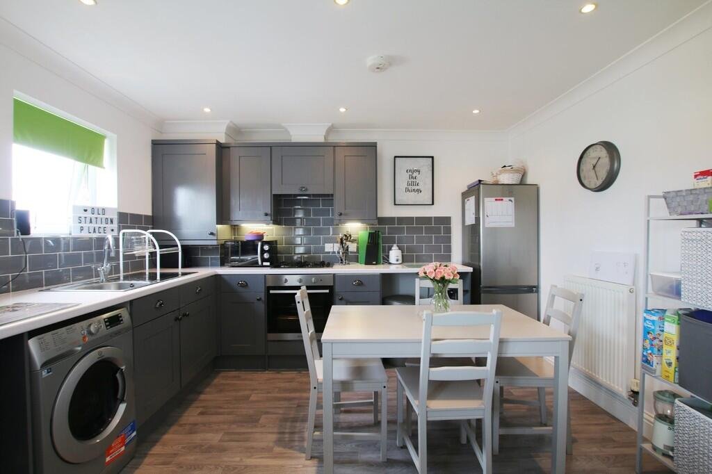KITCHEN AREA 3.62m (11’11”) x 2.61m (8’7″)Fitted with a modern range of wall and base units with breakfast bar area, washing machine and fridge/freezer, single electric oven and four ring gas hob with extractor over, boiler cupboard and window to side.