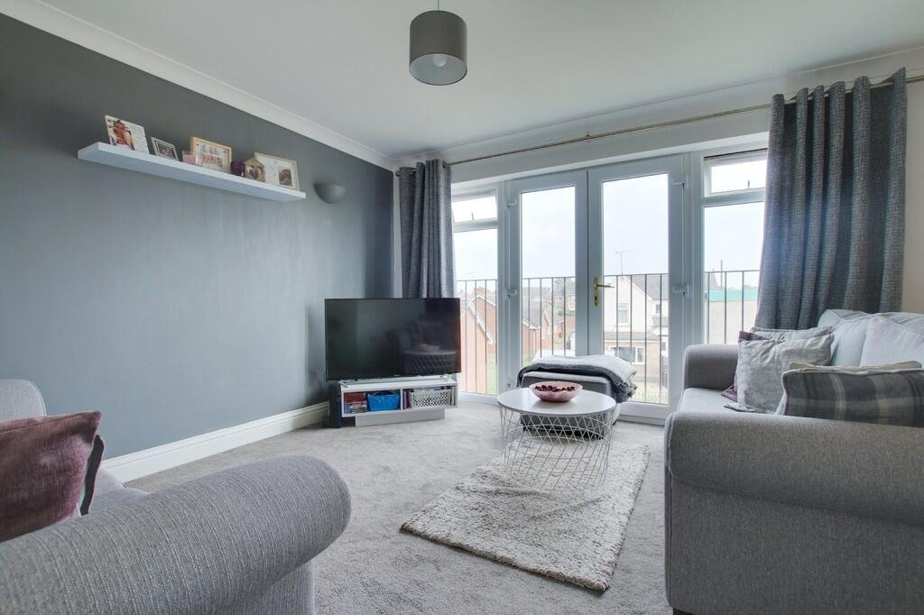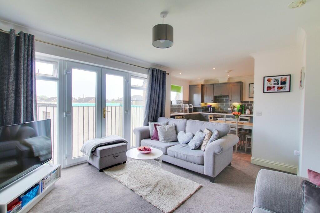 LIVING AREA 3.98m (13’1″) x 3.97m (13′) max.Double doors opening with Juliet balcony and windows to each side. Open plan to kitchen.