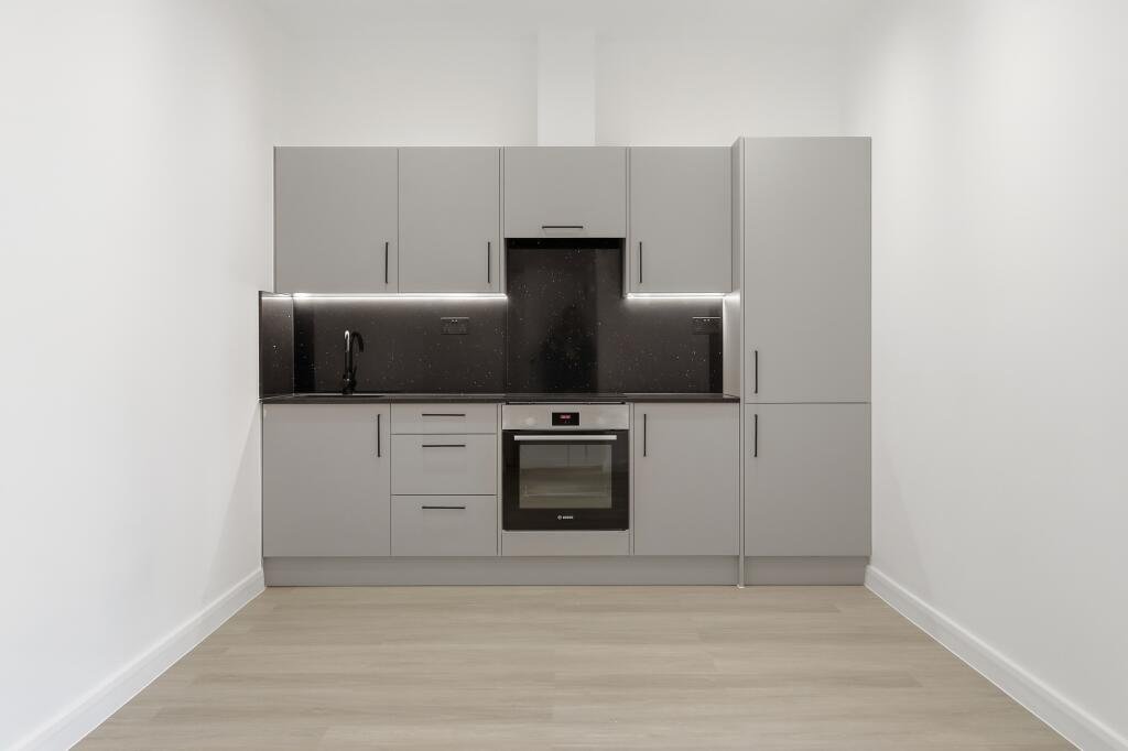 Designed with modern living in mind, the apartment features a bright open-plan reception with a fully fitted kitchen complete with integrated Bosch appliances, two bedrooms each with a fitted wardrobe, and elegant family bathroom. Finished with engineered timber flooring, the property also includes a separate storage cupboard, intercom entry system, and benefits from **off-street residents parking.
