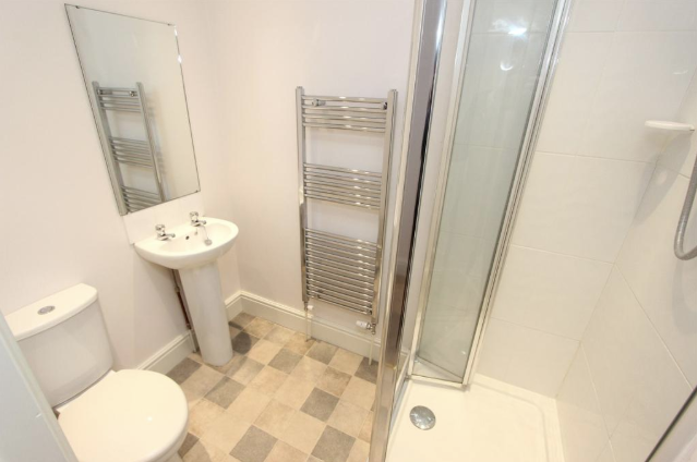 Comprising panelled bath with shower over, low-level W.C. washbasin, heated towel rail, spotlights, vinyl floor, window to side aspect.