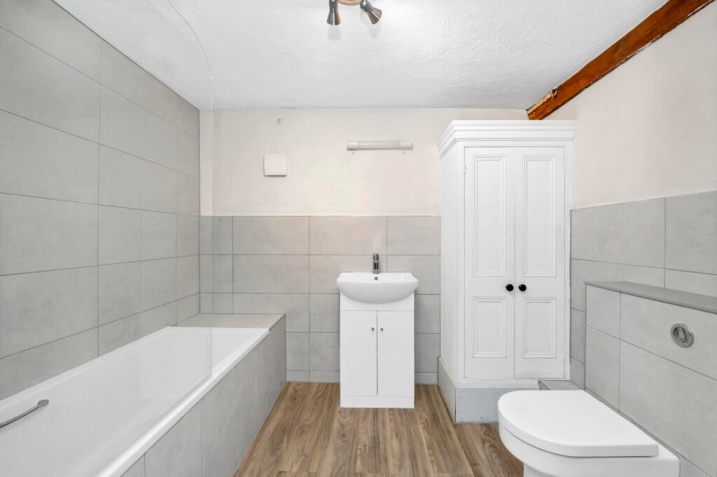 BATHROOM: Side panelled bath with shower attachment over, pedestal wash hand basin and W.C. Part tiled walls. Vinyl floor covering. Cupboard housing the gas central heating boiler. Exposed wall timbers. Chrome towel radiator. Ceiling downlights.Â