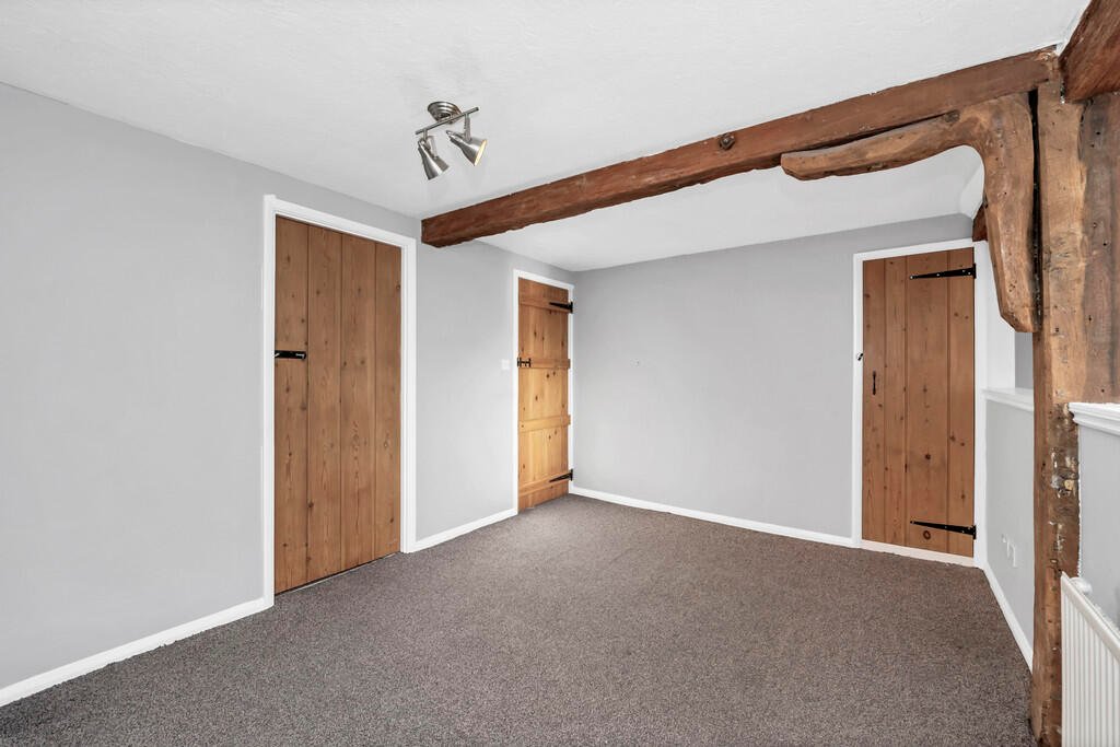 BEDROOM 2: 9’10 x 8′ (3.00m x 2.44m). Window to front aspect. Built-in triple wardrobe. Exposed timbers. Ceiling downlights and radiator.Â
