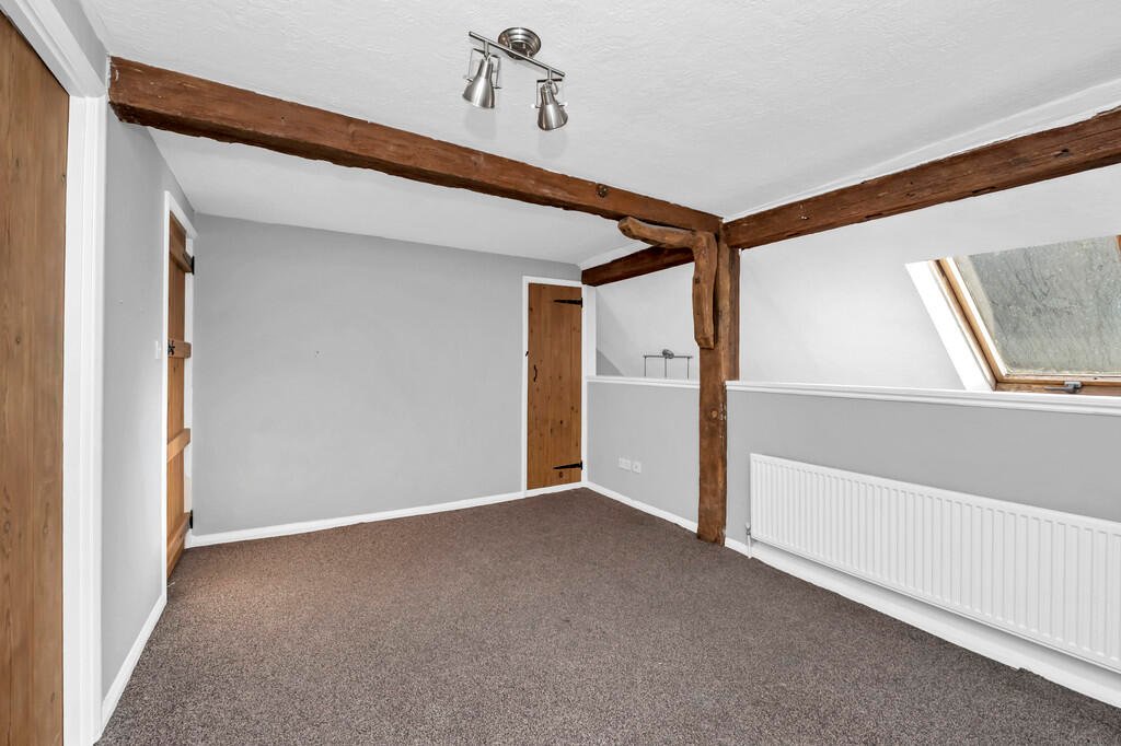 defined into two separate areas with stairs to first floor. Wealth of exposed supporting timber beams and studwork. Feature brick fireplace with inset cast iron Victorian style fire. Three Velux windows to rear aspect and window to front aspect. Part vaulted ceiling with mezzanine gallery above. Two radiators. Ceiling spotlights. Engineered wood flooring. TV point.Â